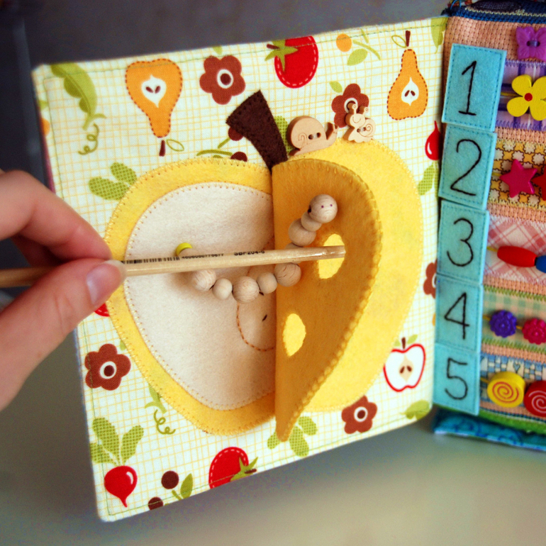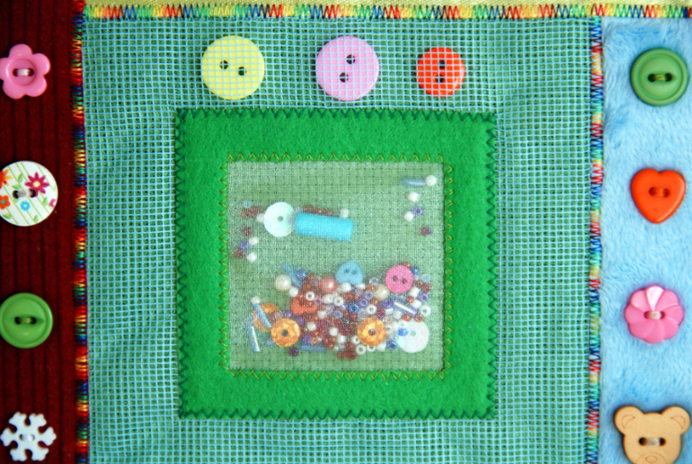 5) Тактильная сторона. По краю пришиты тканюшки разной фактуры с пуговками. У некоторых пуговок есть пара, которую нужно найти. Три пуговки под сеточкой можно передвигать пальчиками по кругу. Ну а в серединке просто "искалка" с маленькими сокровищами)))