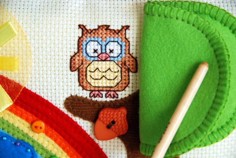 Уточка вышита крестиком, её можно "вытащить" из озера. Сова и лиса тоже вышиты. Радуга сделана из фетра, на каждой полосочке ещё пришита пуговка. Ствол дерева - вельвет, Крона - фетр, но она ещё и шуршит. Солнышко сделано из лент. Получилось много разных фактур на одной страничке)