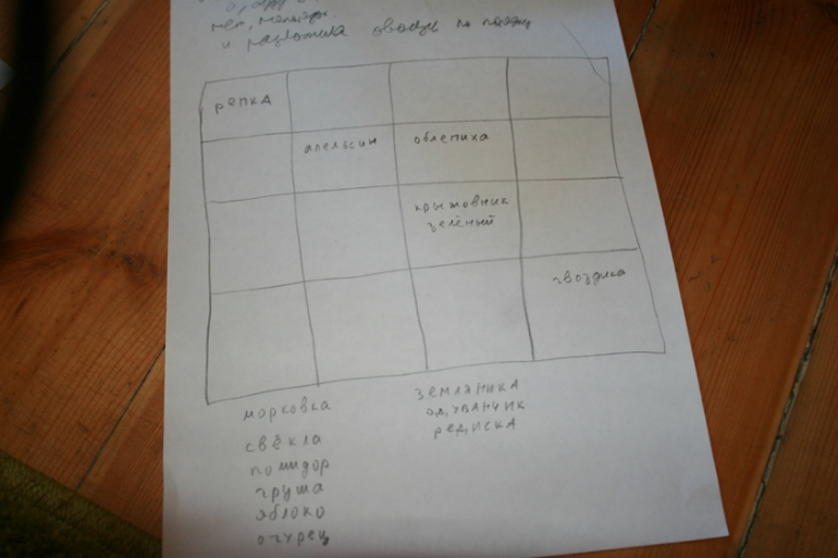 Нашла семена овощей (огурец, репка, морковь), пошла на огород. А огород не простой же, а математический. Требовалось эти 3 овоща рассадить рядами так, чтобы каждый ряд от другого на грядке нашей отличался. И каждый овощ в ряду встречался только один раз.