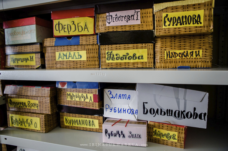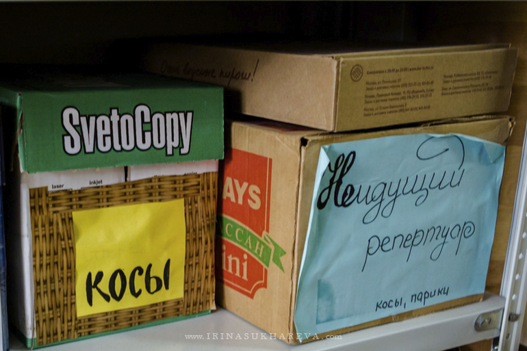 Здесь же хранятся всевозможные парики, шиньоны и прочие аксессуары, которые могут понадобится для создания образа. У каждой актрисы свой набор.