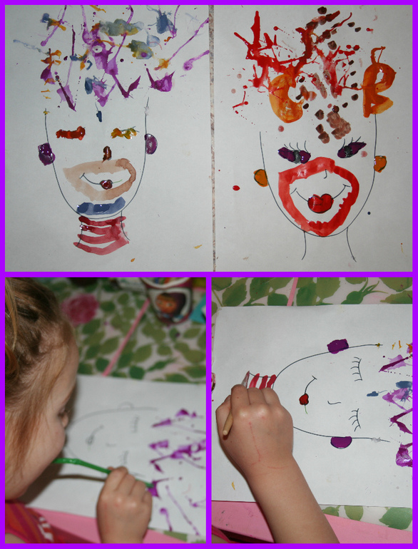 Идея с салоном красоты понравилась Камику, поэтому я нарисовала еще пару рожиц, которые она украшала уже с помощью акварели и кляксографии. Такие прикольные персонажи получились :-)
