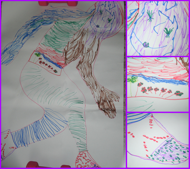 Камилла захотела изобразить свой весенний портрет в полный рост, и у нее получилась вот такая интересная картина, которую мы назвали "Бегу на встречу к Весне!" Я помогла только обвести ее тело в выбранной позе на куске обоев, все остальное она придумывала и делала самостоятельно. Мне очень понравилось, что она уделила подробное внимание аксессуарам. Как в жизни, так и в живописи она не забывает об этих ярких акцентах :-)