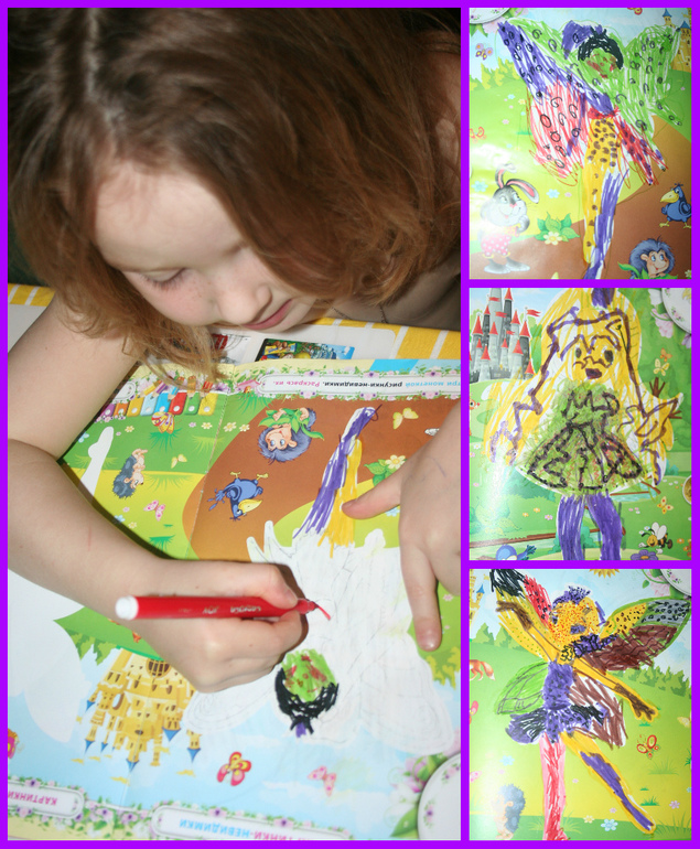 В марте у Камилки особой популярностью пользовалась волшебная раскраска, где изображения стираются монеткой. Это действие ее очень вдохновляло, и все работы получались очень яркими.