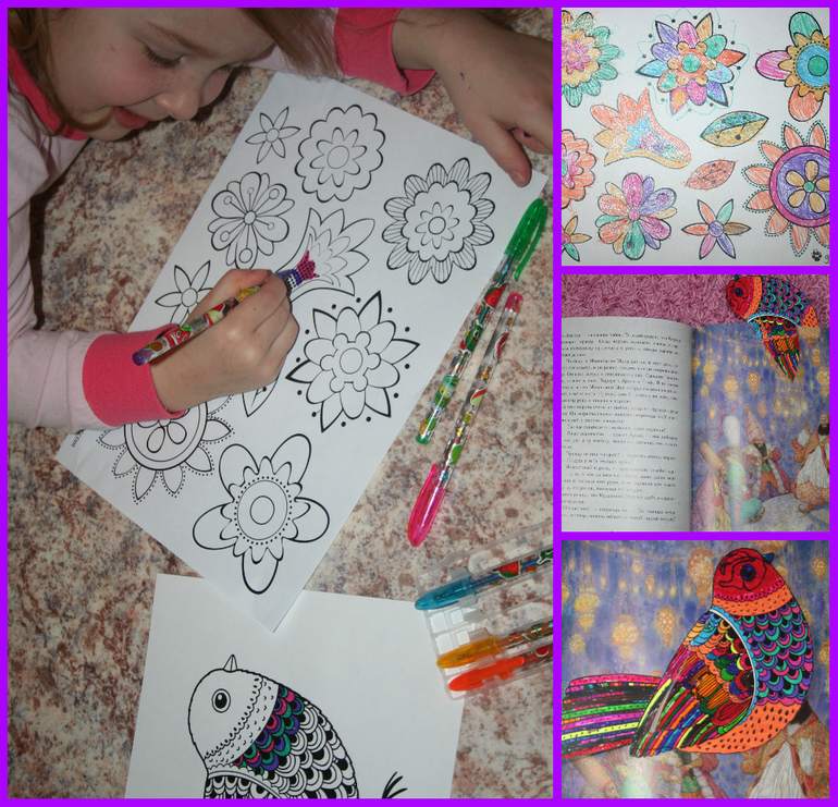 Очень красивые и затейливые раскраски я нашла вот . И мы их не только с большим удовольствием вместе раскрашивали, но и воплотили в жизнь вот эту идею о закладке-птичке :-)