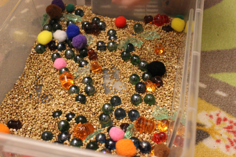 Это один из самых простых вариантов - гречка, стеклянные шарики из Фикс-прайс, пластмассовые овощи, желуди и листики из Фикс-прайс и мягкие помпоны для творчества (их можно купить (тут).
