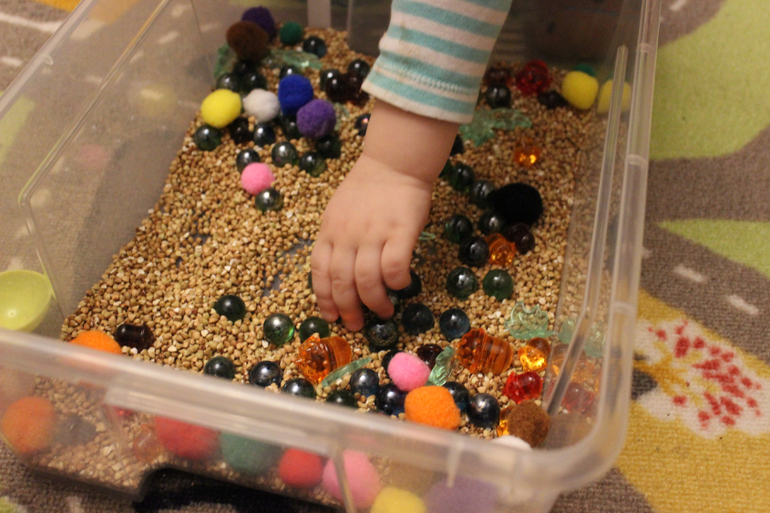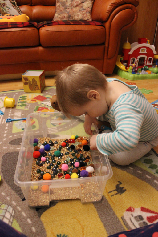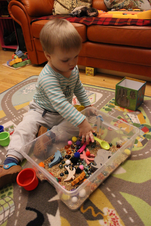 Начну с очень популярных ныне сенсорных коробок. У нас с ними пока не очень лады, ибо сын большой деревянной ложкой все разбрасывает по комнате. Хотя безусловно его внимание она очень привлекает. Я решила, что у нас "сезон" сенсорных коробок будет на даче, поэтому ждем наступления тепла)