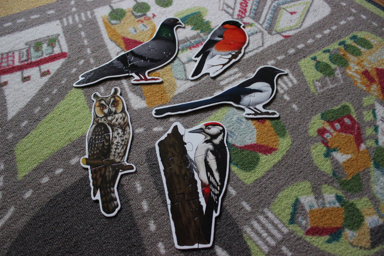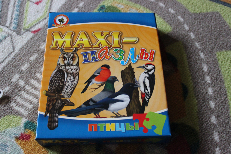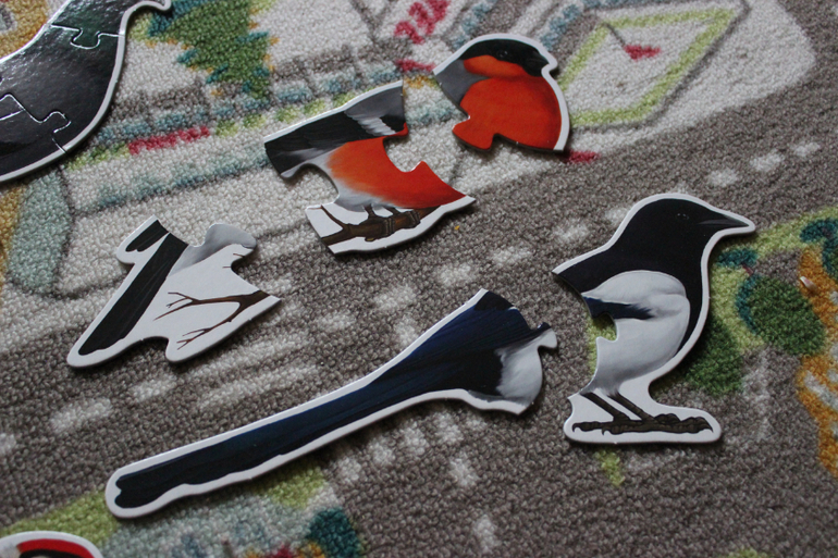 Maxi-пазлы, покупала тут. Решила на пробу купить один набор с птицами. Пока Костю не сильно они интересуют, как-то с картонными пазлами у нас пока не лады... Но мне понравилось качество исполнения, хороший плотный картон, яркие цвета, большой размер). В наборе 5 птиц, сорока состоит из 2 частей, снегирь из 3-х, ну и так далее по возрастающей.