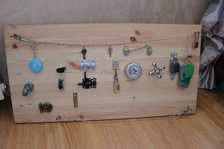 Ну, и давно обещанная, хоть и недоделанная - наша "Бизиборд" (не люблю это слово), пусть будет просто - развивающая доска для моторики.