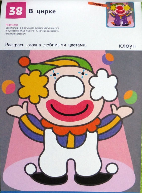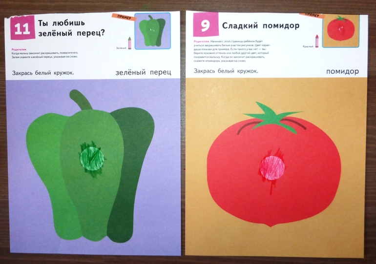 Все фрагменты картинок окружены цветным фоном, если малыш выйдет за их границы, картинка будет выглядеть по прежнему аккуратно и ребенок не расстроится, что у него что то не получилось.