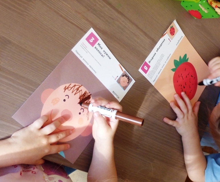 с 1 по 8-е задание на почти «свободное творчество» - рисование штрихов, закорючек, линий, точек, все это в игровом варианте, например «нарисуй макароны», «нарисуй кетчуп на омлете», « нарисуй черные точки на клубнике», «нарисуй на мороженом карамельную крошку»