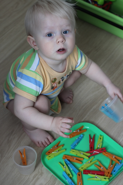 Конечно, это из разряда не только "кухонных игр", но мы играем на кухне. У меня под стульчиком помещается прекрасная продолговатая коробка (на фото ниже она видна, салатовая), в которой складываю предметы для Мишуткиных игр, там и лежат прищепки. Вот с ними и играется, складывает их в стаканчики (от молокоотсоса, кстати, приспособила ненужные)