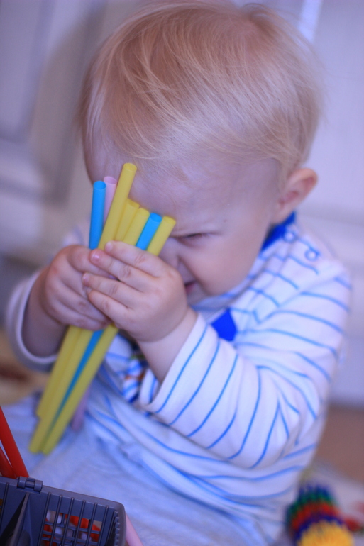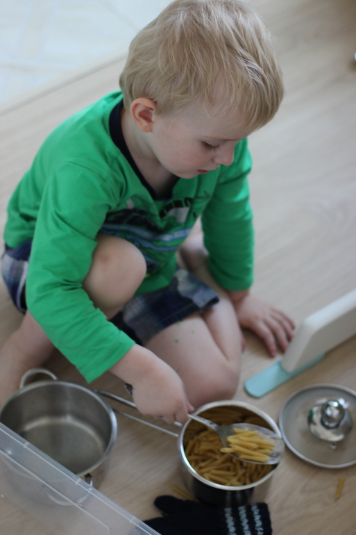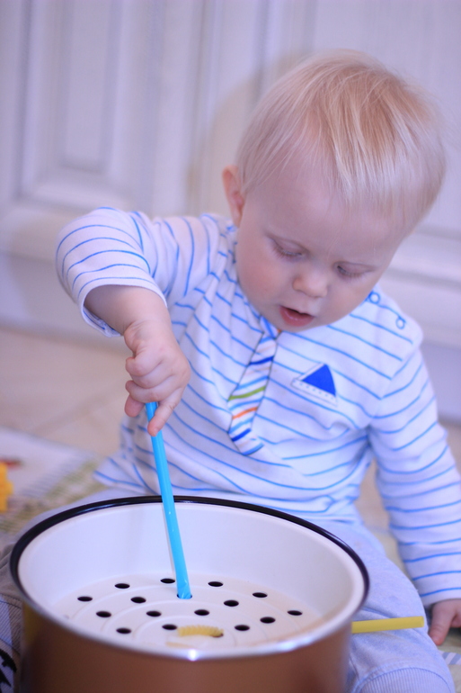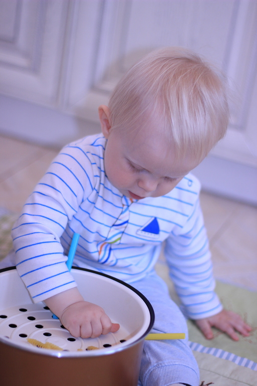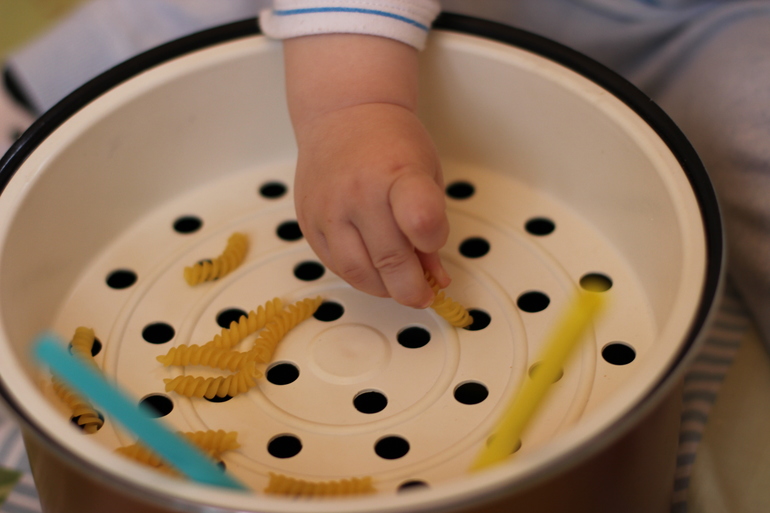 Сначала вставлял трубочки в отверстия, затем предложила макароны-спиральки (мелкие, у barilla есть такие, подходящего размера и для детских ручек, и для отверстий подставки) Мишу забавляет, как макароны падают в кастрюлю, он пытается заглянуть и наблюдать за ними)