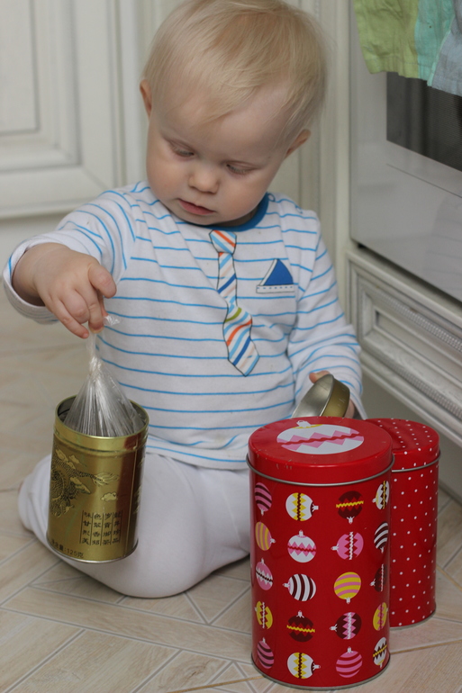 - играет с любыми банками и ёмкостями с крышками, снимает и надевает крышки, из жестяных банок, баночек с пюре строит башенки