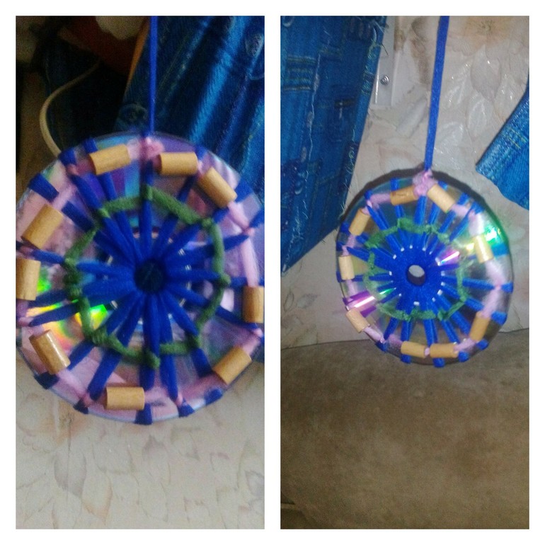 Два диска блестящей стороной наружу, обмотала нитками, а потом,.как паутинку,другими нитками с бусинками. Делается за 10 минут, а настоящий делать намного сложнее