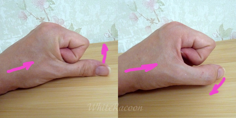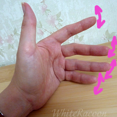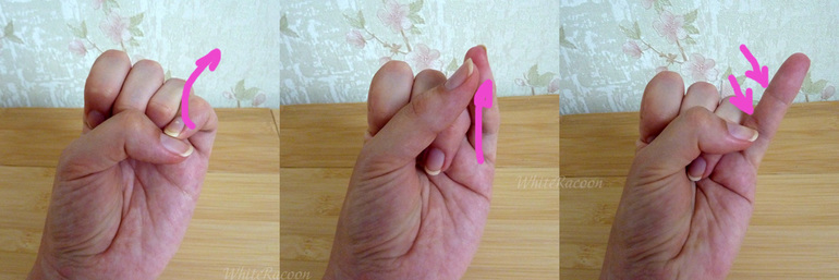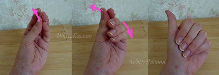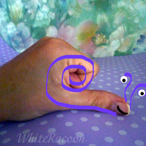5) Дочка придумала: у улитки в домике есть кладовочка или шкафчик, он расположен далеко от "входа", это - мизинец. Когда улитка хочет поесть, она открывает свой шкаф: пальцы сжаты, большойподцепляет мизинец за ноготок и поднимает вверх. А потом ноготь большого пальца, голова улитки то есть, смотрит, что есть на полках (полки - это складки между фалангами) и ест оттуда, что нравится.