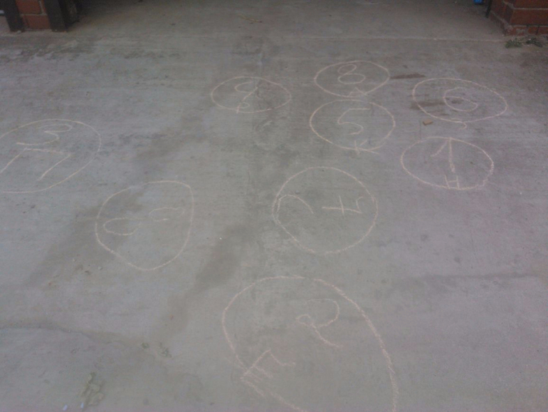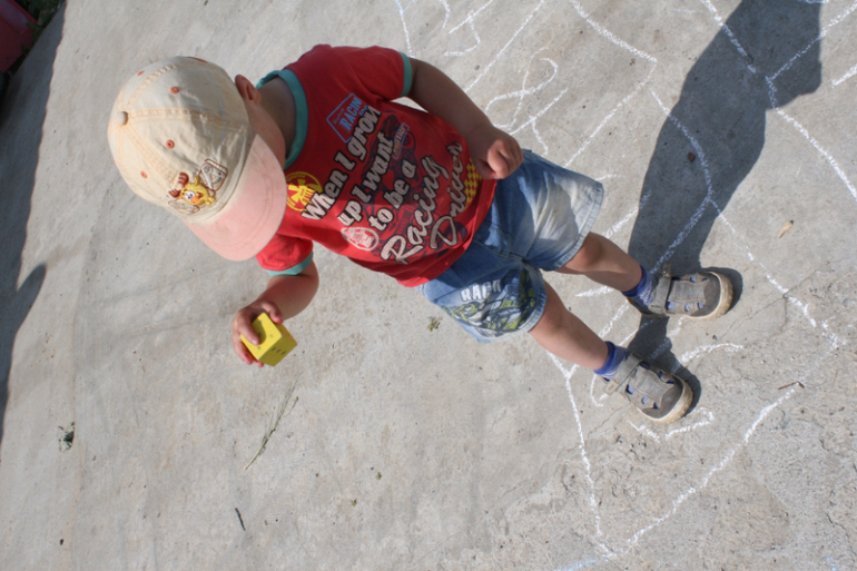 1. Сделать игру-бродилку. Для этого нам нужен мел разных цветов , чтобы нарисовать простые клетки, клетки, где нужно остановиться (или наоборот - получить дополнительный ход).А вместо пешек будут двигаться дети. Нюанс: либо взрослый должен бегать и подавать кубик, либо каждому участнику дать свой кубик, потому что детки могут оказаться далеко друг от друга в процессе игры.