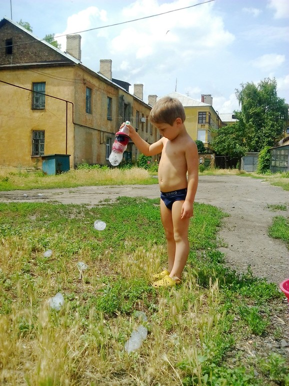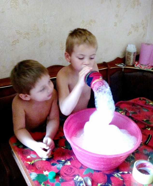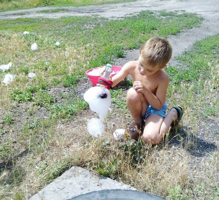 Мы начали дома. На обрезаннные бутылки надеваем махровый носок, закрепляем резинками, обмакиваем в мыльный раствор и дуем.