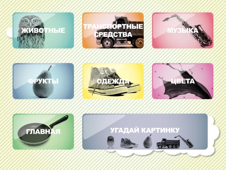 4) Учим слова. Стандартный набор. Картинки красивые, по несколько вариантов к каждой картинке.