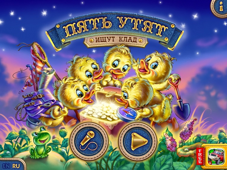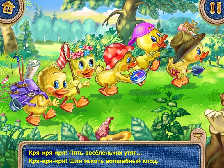 7) Песенка, она же караоке. Пять утят (5 Ducklings) Песенка с бегущими словами про утят, которые искали клад. Заводная. Картинки сменяются, всё анимационное.