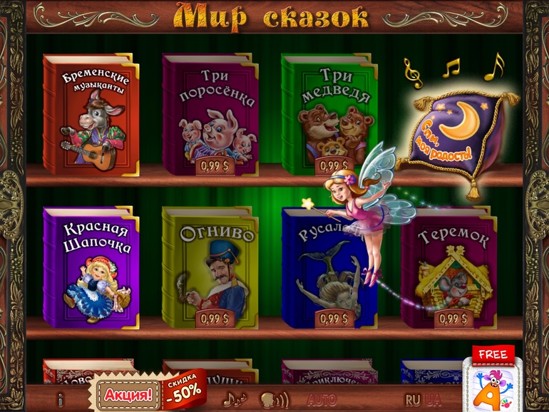 5) Мир сказок. Книги можно покупать и есть бесплатные, еще бесплатно прилагается колыбельная, почему-то ее слушать и рассматривать нравится больше. Приложение хорошее.