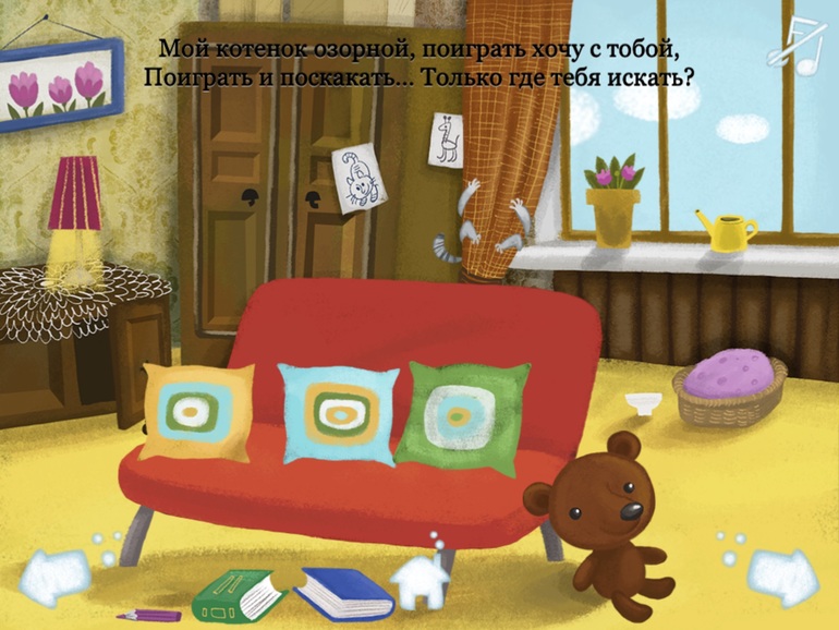 1) Потешки 1 и 2. Анимированные потешки, голос их рассказывает, ребенок играет с персонажами. Мы вот любим искать котёнка :)