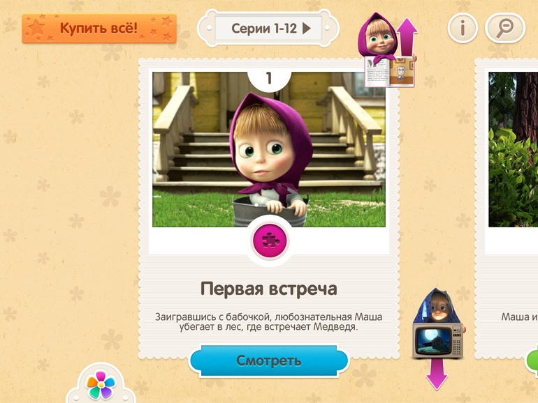 3) Маша и медведь. Всеми любимая Маша. В этом приложении еще сказки от Маши и пазлы. Удобно конечно, что говорить, по такому принципу есть многие мультфильмы.