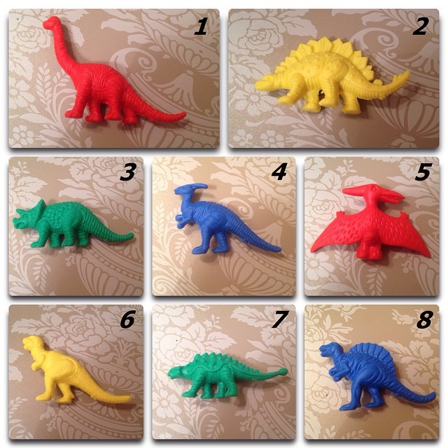 1 брахиозавр, 2 стегозавр, 3 трицератопс, 4 паразауролоф, 5 птеранодон, 6 тиранозавр, 7 анкилозавр, 8 спинозавр