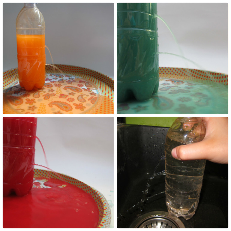 Протыкаем шилом дырки на разных уровнях, заклеиваем их скотчем, набираем подкрашенную воду (как видно из фото мы еще побаловались красками:)), отклеиваем скотч и наблюдаем за струями, которые оказываются разной длины. Пытаемся предположить почему.