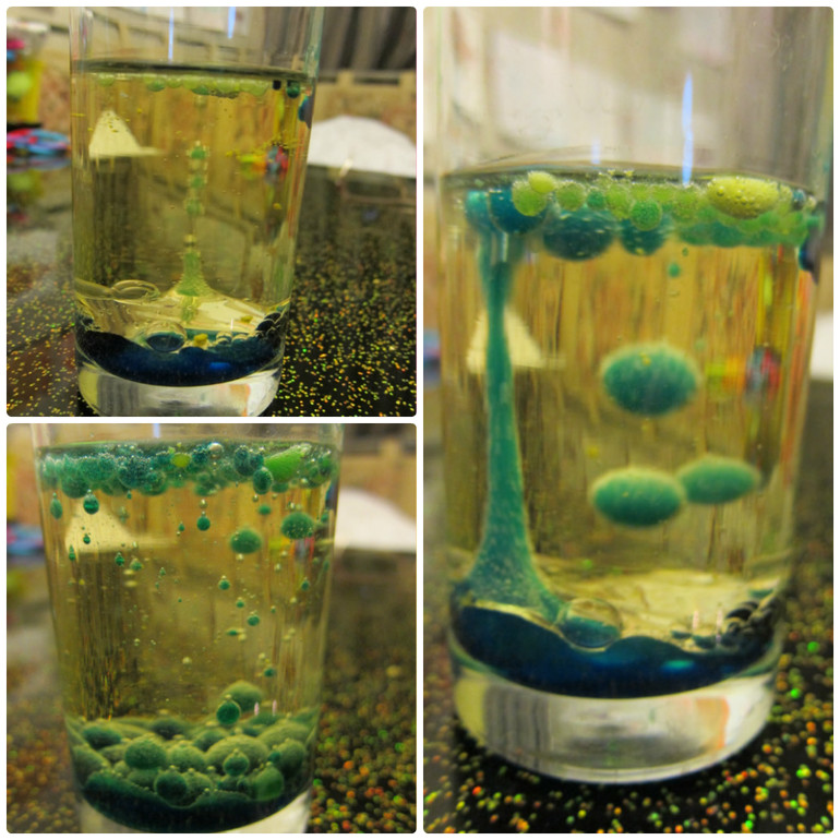 Наливаем масло в высокий стакан, добавляем воды, она опустится вниз, затем немного жидкого красителя. Не красьте воду сразу, потому что когда будете заливать, окрашенные пузырьки воды останутся в масле и опыт уж не будет таким эффектным. Все готово! Бросаем шипучую таблетку и наслаждаемся зрелищем! Бросаем следующую и так пока не закончится пачка)))