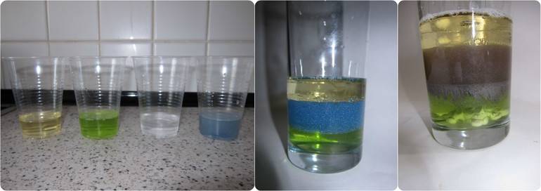 Сделали сначала без водки (см. второе фото), затем с ней, она, конечно, не легла слоем, а смешала некоторые имеющие. Вылили, сделали заново, а затем Остапа понесло Данька стал экспериментировать со всем, что попадало под руку. Первым попал клей ПВА, который можно наблюдать на дне на третьем фото, хотя он был добавлен последним))