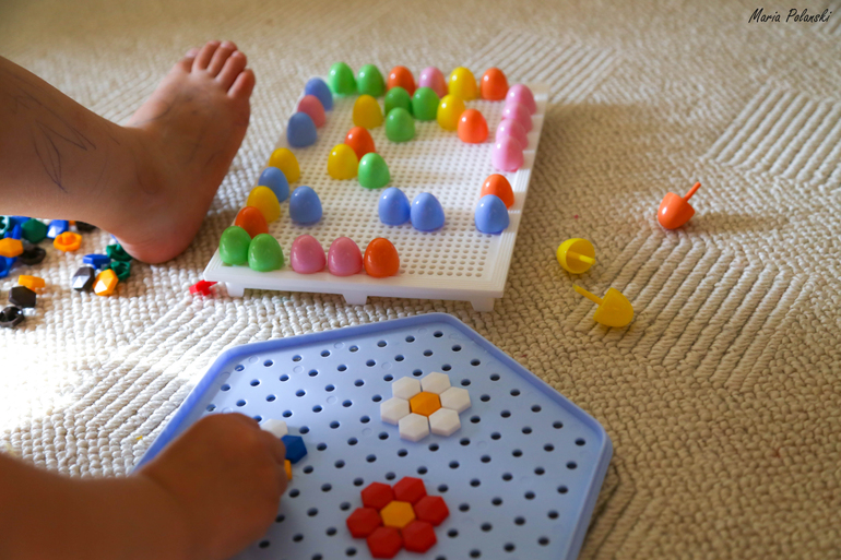 Нашла в шкафу наши мозаики и это был хит на целых 2 дня. Может быть был и бы потом, но мне надоело собирать детальки)) На Вариной ножке тут видно результаты ее утреннего творчества)