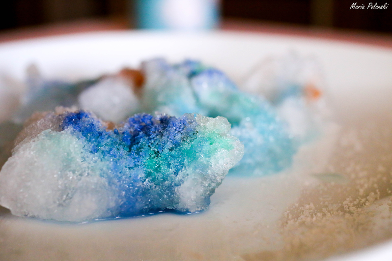 Если посмотреть на кусочек цветного льда на солнышке, то кажется, что это огромный драгоценный камень! Фотография конечно не передает, как лед сиял и как впечатляюще выглядели переливающиеся кристаллики!