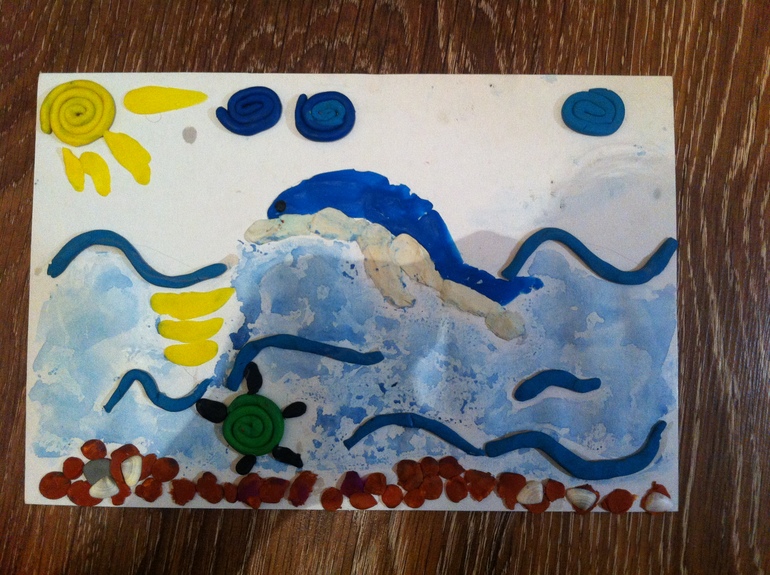 Вдохновленные недавним отдыхом на море, и созерцанием дельфинов решили эту встречу запечатлеть на пластилиновой картинке. Просто размазывать пластилин по картинке Софье не очень нравится, быстро надоедает, а вот создавать картину из жгутиков ее завлекло.