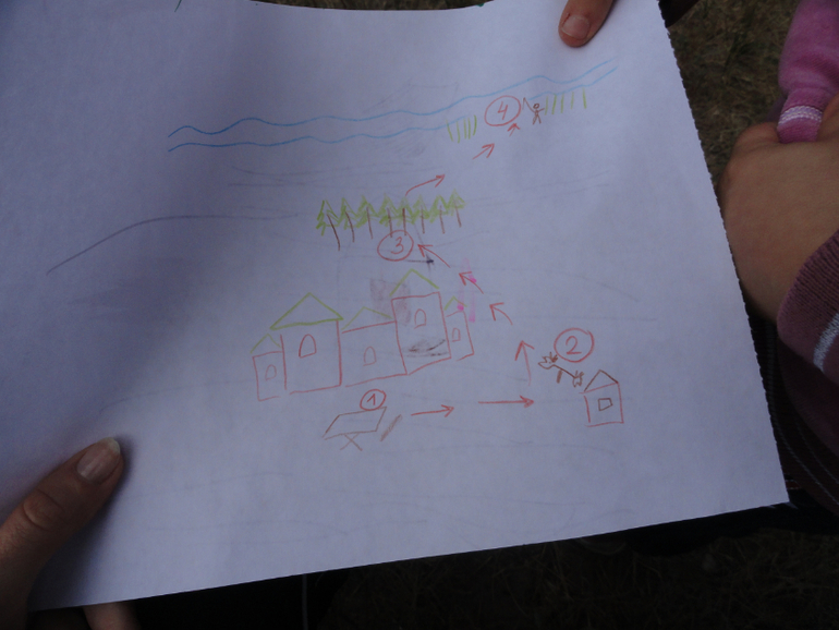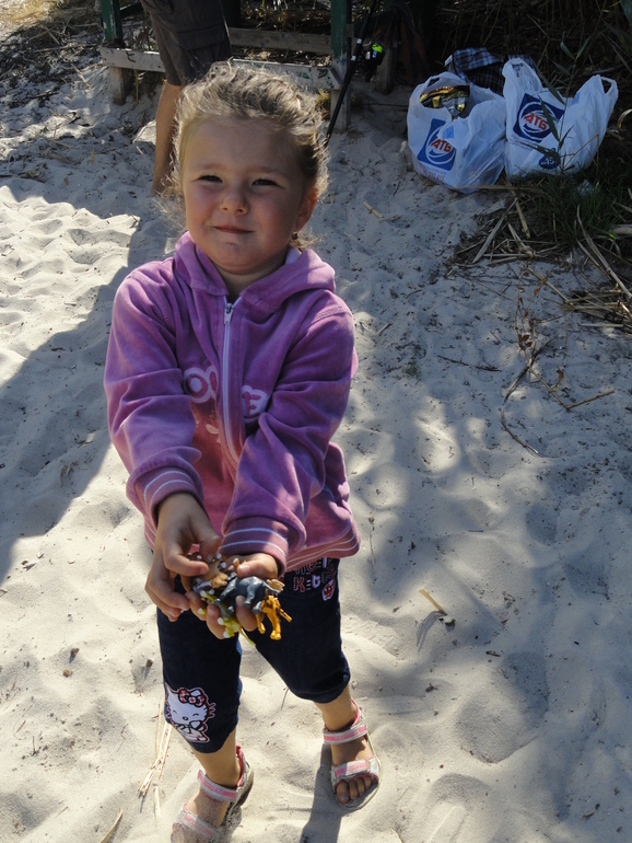Везде оставили по печеньицу (я подменила их потом на краски и сюрприз). И отправились в последний пункт на карте - на пляж, где папа ловит рыбу. Честно поделилась печеньем с папой и еще одним дядей, который приходил посмотреть. На пляже спасли животных из песка, получили за это баночку краски.