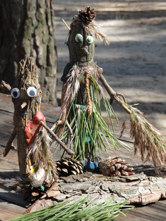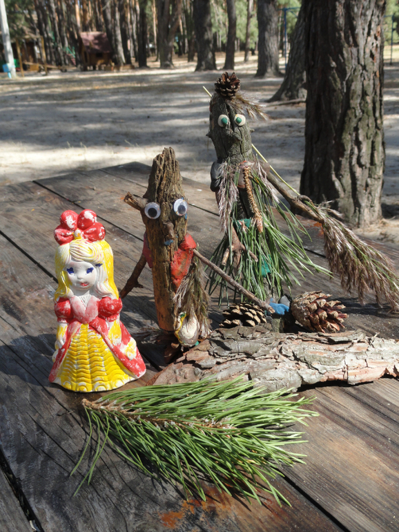 Выдаю Кате пластилин и кусок старой ветки. Из неё делаем Лесовичка. Вернее хотела я сделать Лесовичка, но у меня получилось нечто. похожее на даму))) Поэтому решили, что сам Лесовичок ушел в лес по делам, а нам прислал свою жену и сыночка. Катя делала сыночка.