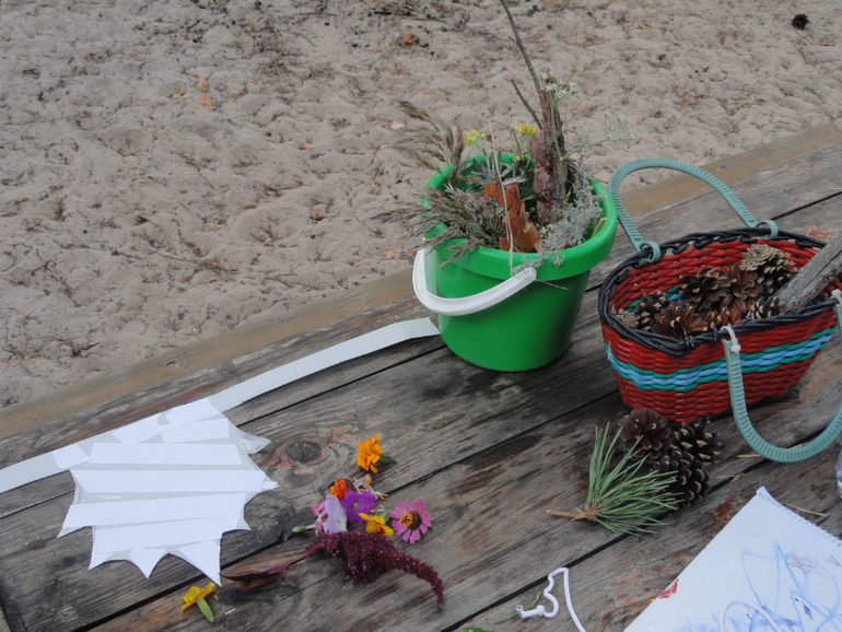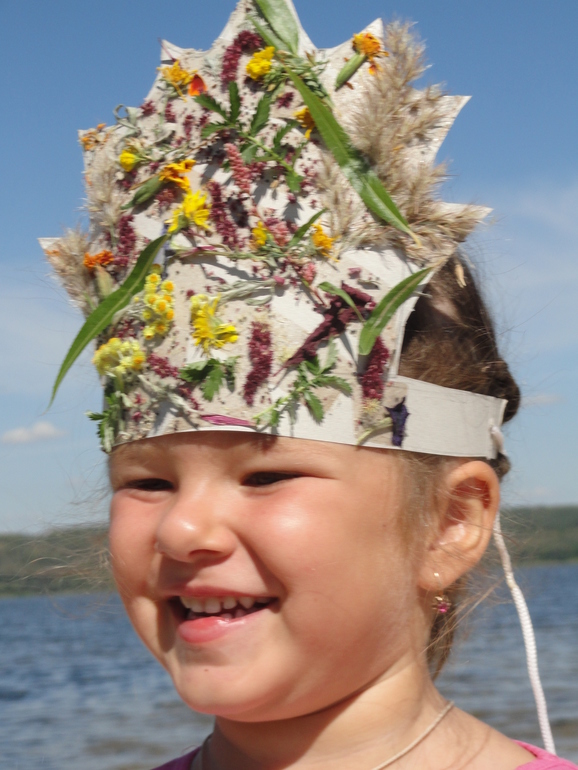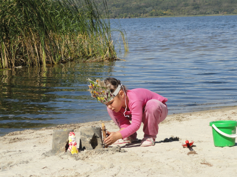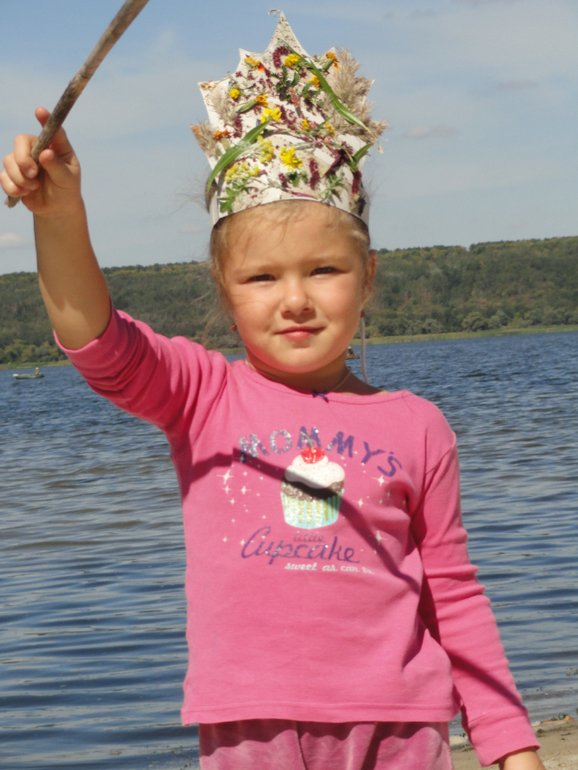 О, сколько всего мы успели сделать за эти дни. Даже сама не ожидала. Но теперь нужно придумать яркое прощание! Моей идеей было запустить лодку. Сделала я её конечно сама из коры, пластилина, палочки и картона, Катя помогала украшать. Посадили мы туда маленького Лесовичка и отправили его на ту сторону (рядом с базой заливчик) - к папе Лешему в лес. На берегу ему построили дом из песка. Запуск был коротким, ветер сразу унес кораблик, но Катя все равно осталась довольна.