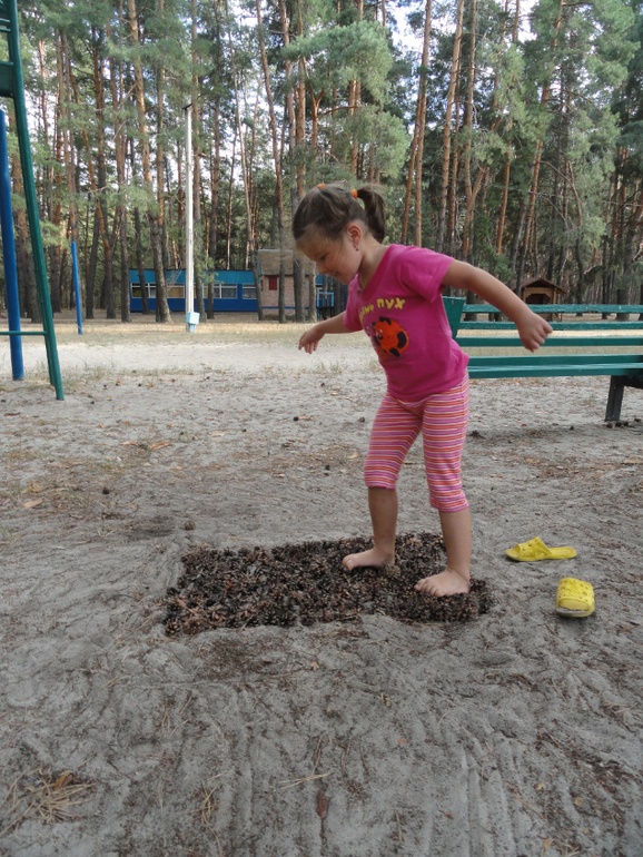Этот день прошел в расслабленном состоянии. Я сообщила Кате, что Лесовичок ушел в лес до завтра. Нас же просил к его приходу "сшить" ему ковер из шишек. Надо сказать, что делали мы его 2 дня))) А потом даже ходили по нему сами.
