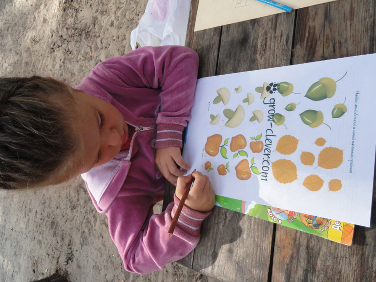 Целую неделю мы провели в лесу на базе отдыха. Детей других не оказалось(сентябрь ведь), так что развлекать и занимать дочь предстояло мне. Времени на составление четкого плана игр не было, так что я набросала себе несколько идей, выбрала пару добрых сказок про лешего, загадки про лес, сделала осеннее мемори, взяла пару журналов по теме, карандаши, краски, ножницы, скотч. Наша лесная история возникла уже в процессе.