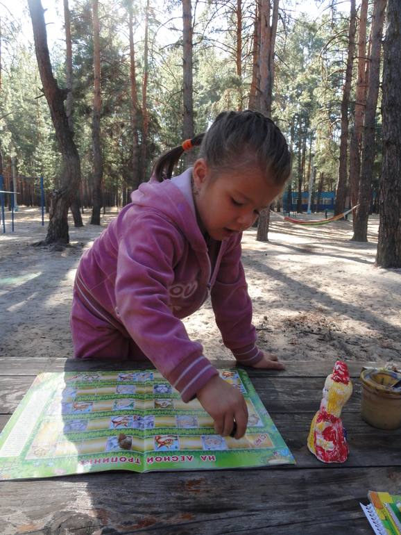 День начали с игры-ходилки, которую неожиданно нашли в одном из журналов. Кубик у меня всегда в сумке, а вместо фишек - природные материалы.