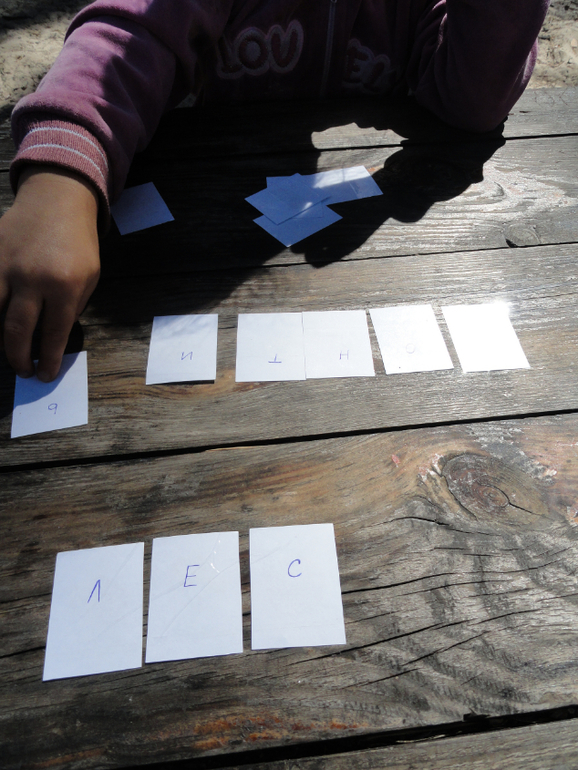 На части карточек с белой стороны я написала буквы. Каждый из выигранных карточек с буквами сложил слово на тему осени. Кате помогла конечно.