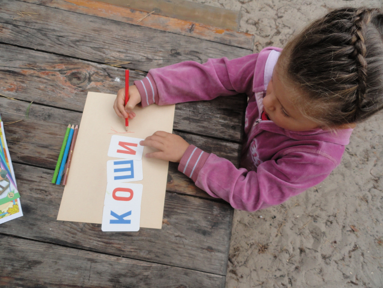 Т.к. мы уже понемногу читаем, то письмо Катя одолела практически полностью. Первое задание предстояло выполнить возле домика за столом. Разгадали (устно) кроссворд в журнале про осень и получили буквы. Из них сложили слово КОШИК(последнюю букву дописали)