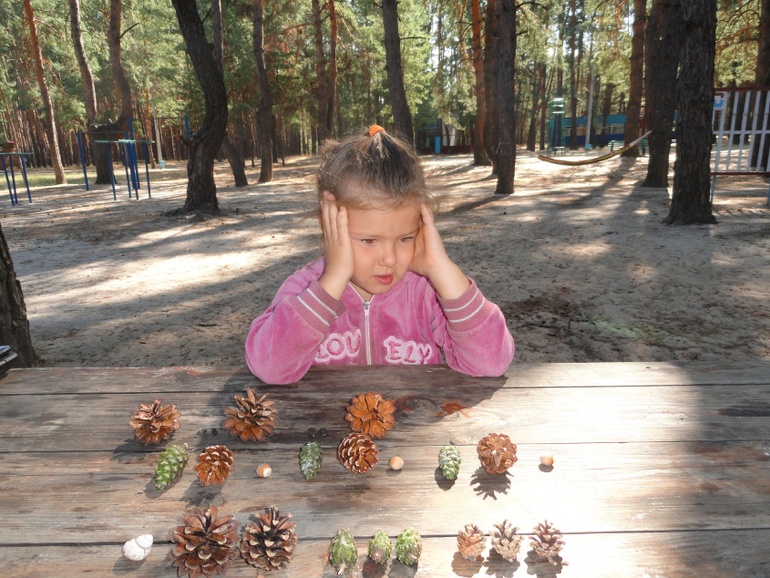 Нам нужна корзинка(всегда беру с собой в лес). Лесовичек хочет посмотреть, какая Катя запасливая(на скорость собирали кучки шишек), меткая (забрасывали в корзину), смелая (на нас напал дракон - закидали его шишками)
