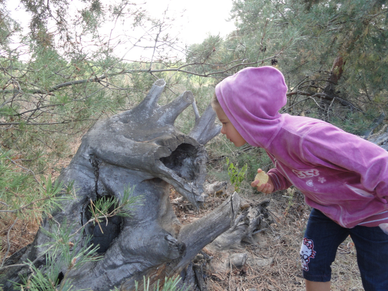 Дальше карта вела нас в лес. Нужно было собрать всякие дары леса в корзинку и найти 2-3 необычных места (дерево, пень), где оставить Лесовичку угощение. Дерево конечно не сильно образное, а вот пенек удалось найти - просто сказка.