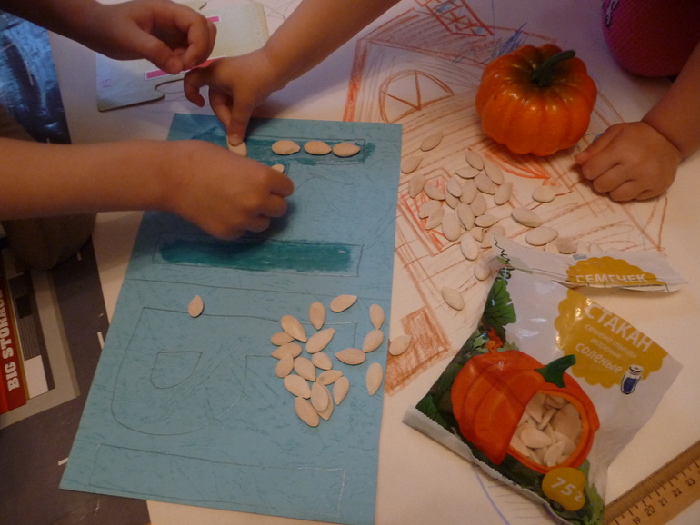 Выкладывали Ы из тЫквенных семечек, пригодились и сотЫ. Правда, семечки пришлось мне переклеить т.к. они практически сразу отпали, помог горячий пистолет.