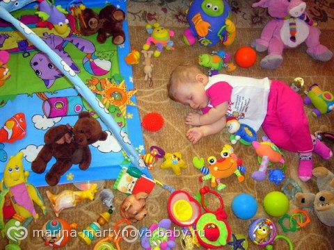 Игры и игрушки для карапузиков от 0 и до годаДевочки, дочке 9 мес, конкретные игрушки, как правило, надолго не занимают, поэтому спустя полчаса игр мы сидим в огромной куче игрушек. Меня такая ситуация смущает очень, ибо на игрушки можно упасть, споткнуться, опять же внимание не сконцентрировать на чем-то конкретном...Наверное, надо доставать по 2-3 игрушки, потом менять...