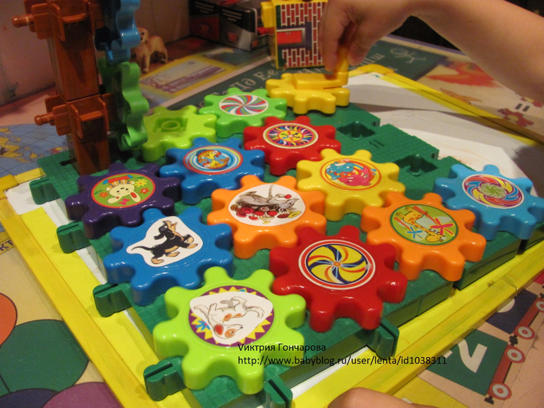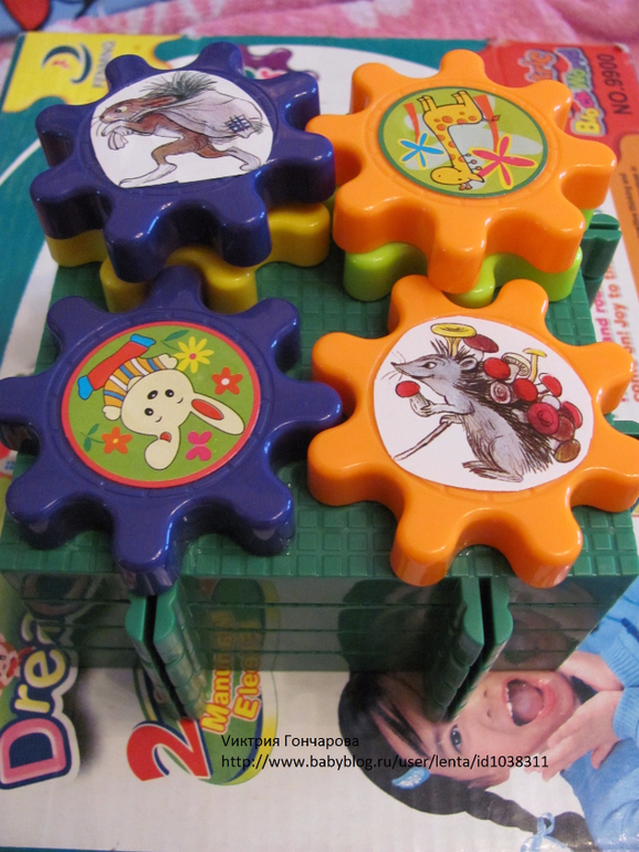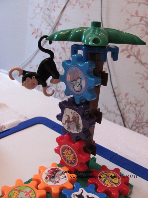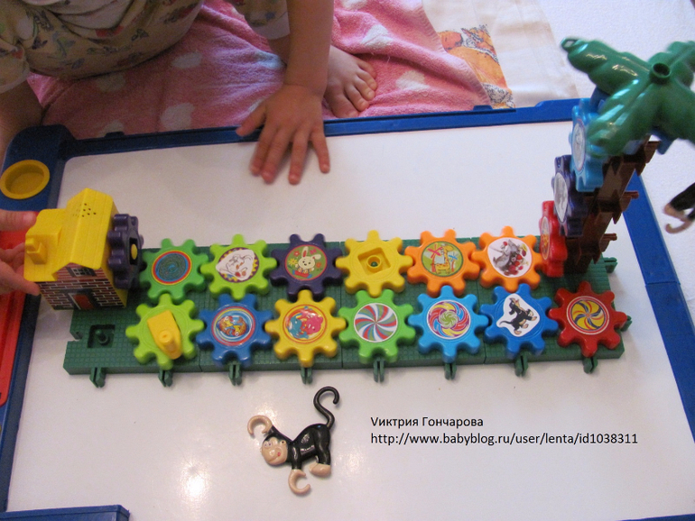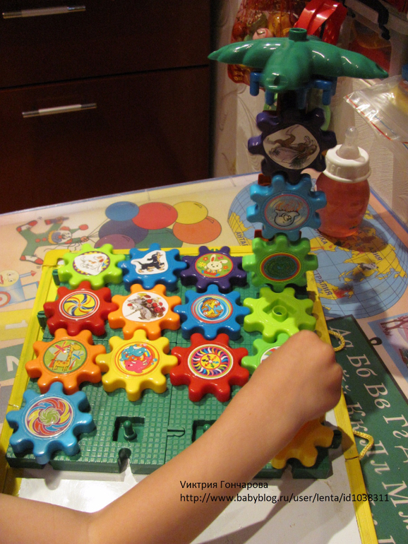 Следующий конструктор с шестеренками. Привлек внимание сына после шариков, в возрасте 1,7. Вначале, конечно собирала сама, ребенок пытался вставлять шестеренки. Конечно понравился эффект кружения, движения шестеренок.