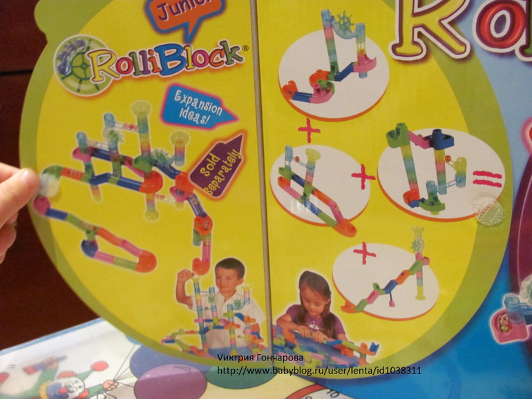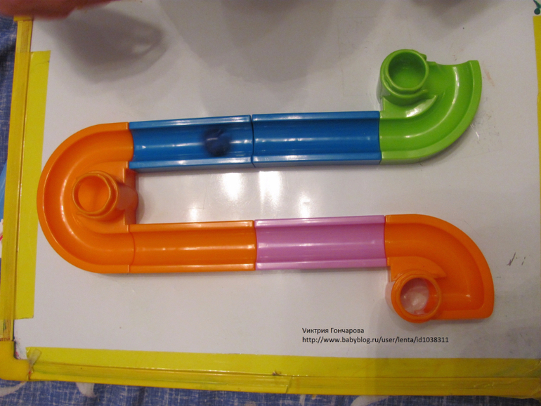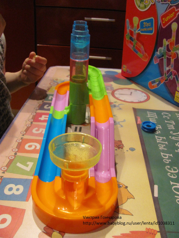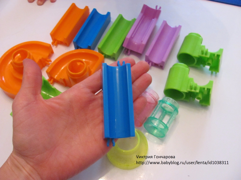 "Веселые горки" от фирмы Бауэр 51 деталь (здесь 65 деталей). Дарила на 3 года. Сначала особого эффекта не вызвал. Недавно только начал им, не скажу что увлекаться, но проявлять интерес.