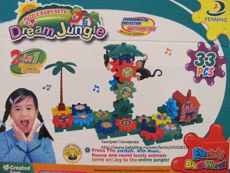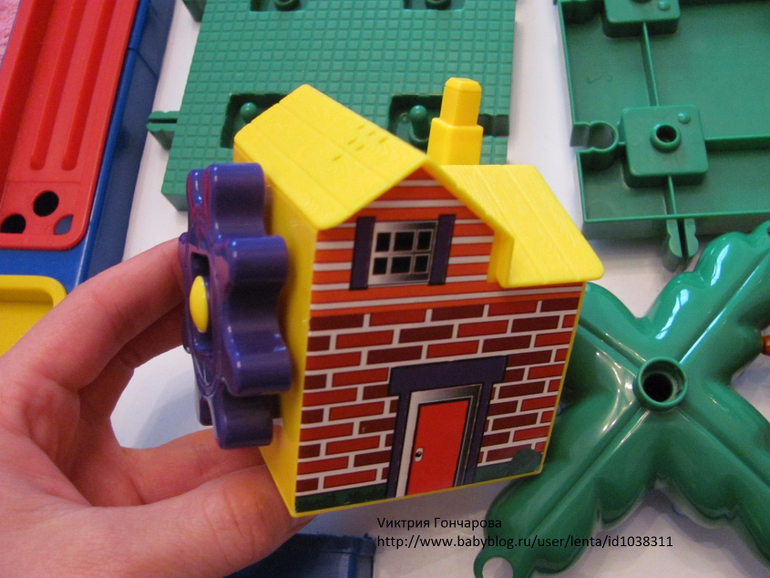А это с домиком, нажимаешь на трубу, и дом издает мелодию и крутится шестеренка, приводя в движение другие.