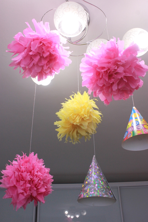 Под люстрой висели праздничные колпачки с помпонами. Помпоны делали из гофрированной бумаги. Делать такие помпоны просто, но муторно. Если вы озаботились праздником заранее, то лучше заказать готовые помпоны из китая. Это будет проще и дешевле. Для поиска на китайских сайтах достаточно набрать paper pompom.