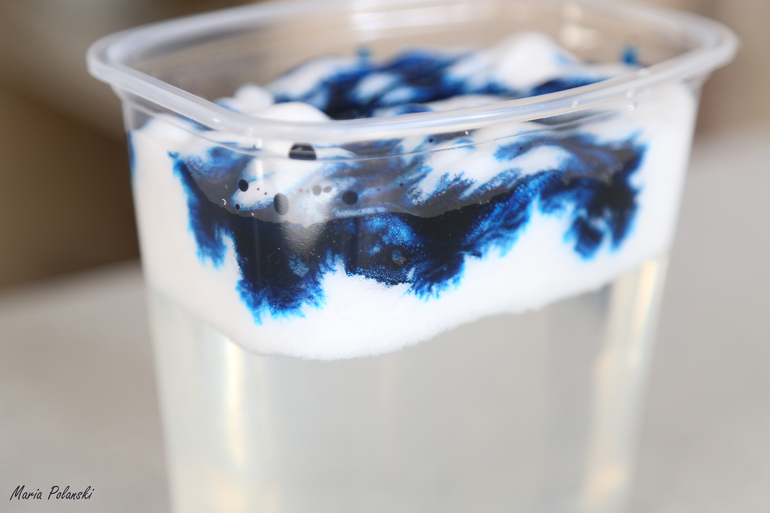 Тучу сделать просто! Берете пластиковый контейнер или любую другую максимально гладко-прозрачную емкость. Наливаете в нее воду, сверху заливаете позаимствованной у мужа пеной для бритья и капаете краски. Я использовала жидкие пищевые красители, потому что они уже в подходящем виде и их не надо разводить и цвет дают очень насыщенный.
